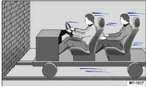 Emniyet kemerlerini takmamış olan yolcular araç ile „bağlı değillerdir". Önden çarpışmalarda bu yolcular, aracın çarpışmadan önce sahip olduğu hızla durdurulana kadar hareket etmeye devam etme eğiliminde olacaklardır! Yolcuların emniyet kemeri takmamış olduğu örneğimizde, araçtaki yolcuların toplam kinetik enerjisi sadece çarpışma anında sönümlenmektedir =>Şek. 60.