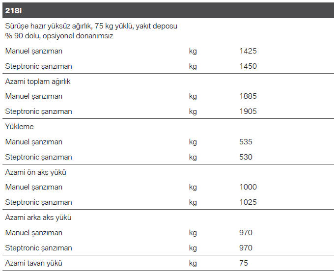 Kullanım kılavuzundaki teknik bilgiler ve spesifikasyonlar referans bilgi olarak sunulur. Araca özel veriler, örn. seçilen özel donanımlar, ülke modeli veya ülkeye özel ölçme yöntemi nedeniyle bundan farklı olabilir. Ayrıntılı değerleri ruhsat belgelerinde, araç üzerindeki uyarı işaretlerinde bulabilir veya üreticinin bir yetkili servisine veya başka bir yetkili servise ya da bir kalifiye uzman atölyeye sorabilirsiniz.