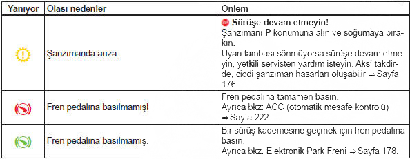 Uyarı lambası sönmüyorsa sürüşe devam etmeyin, yetkili servisten yardım isteyin. Aksi takdirde, ciddi şanzıman hasarları oluşabilir